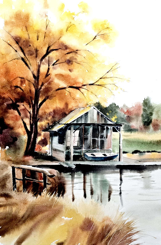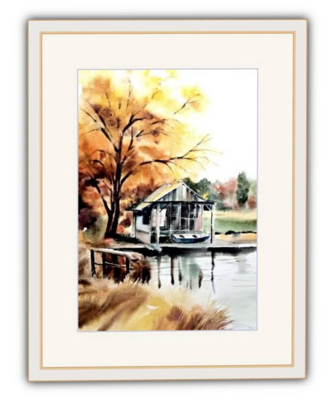 تابلو نقاشی آبرنگ، کلبه ای در آغوش پاییز